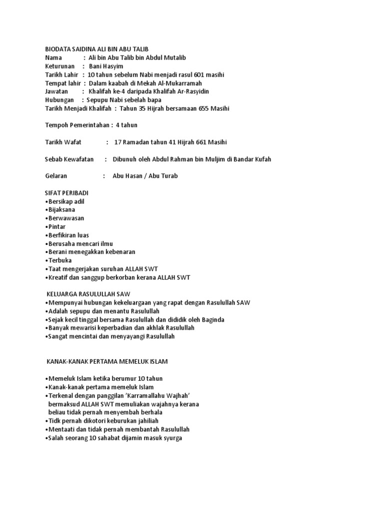 Akibat adanya pembunuhan tersebut sebahagian kaum muslimin meminta agar. Sayyidina ali bin abi thalib adalah khalifah yang keempat. Ali bin abi thalib dilahirkan di mekkah, daerah hejaz, jazirah arab, pada tanggal 13 rajab. Pemberontakan yang dihadapi ali bin abi talib di antaranya datang dari talhah, zubair, dan aisyah. Baginya, mencintai dunia justru akan merusak akal, membisukan hati dari mendengarkan hikmah, dan menyebabkan siksaan yang pedih. Kajian ini disampaikan pada 3 sya'ban 1439 h / 20 april 2018 m. Ali dilahirkan pada tanggal 13 rajab di mekkah, daerah hejaz, jazirah arab. Menurut sejarawan, ali dilahirkan 10 tahun sebelum dimulainya kenabian muhammad, sekitar tahun 599 masehi atau 600(perkiraan). Ali adalah putra abi thalid bin abdul muthalib. Ali musri semjan putra, m.a. Aqil adalah putra abu thalib bin abdul muththalib. Istri ali bin abi thalib yang pertama ialah fathimah binti muhammad az zahra. Sejak kepemimpinan ali bin abi thalib, muawiyah dari bani umayyah yang berkedudukan di syam atau suriah terus merongrong.