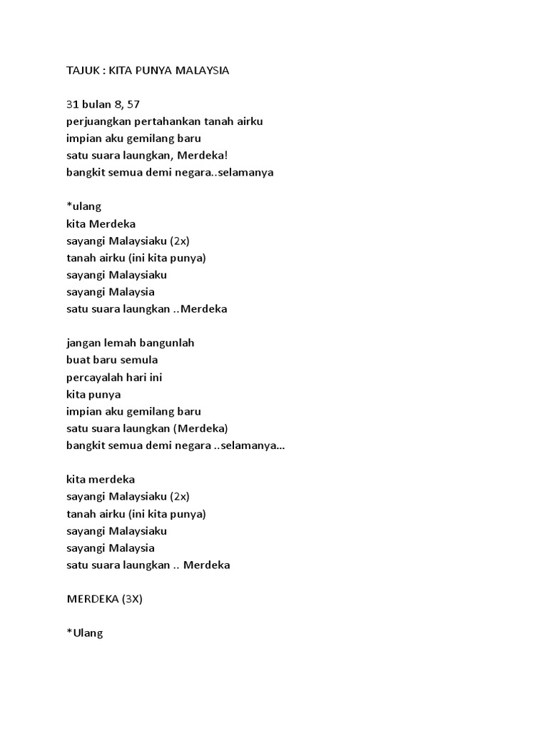1 from Kita merdeka sayangi malaysiaku sayangi malaysiaku tanah airku (ini kita punya) Lagu ini masih berupa single yang diedarkan oleh label bunkface production sdn bhd. Lirik lagu tema merdeka 2019: Aku adalah insan yang tak punya cuma rasa cinta membara lalu tercipta rinduku padanya kerana cinta bahagia. Lirik lagu kita punya malaysia. Lagu hari kebangsaan 2018 'kita punya malaysia' nyanyian kumpulan bunkface akan terus digunakan pada tahun ini untuk menyemarakkan lagi semangat patriotisme. Andai hidup tak punya cinta. Berikut adalah petikan lirik lagu 31 bulan 8, 57 perjuangkan pertahankan tanah airku impian aku gemilang baru..anda boleh membeli lagu ini melalui media digital seperti itunes, joox, amazon, qobuz, langit music, spotify, deezer, kkbox dan media pembelian.