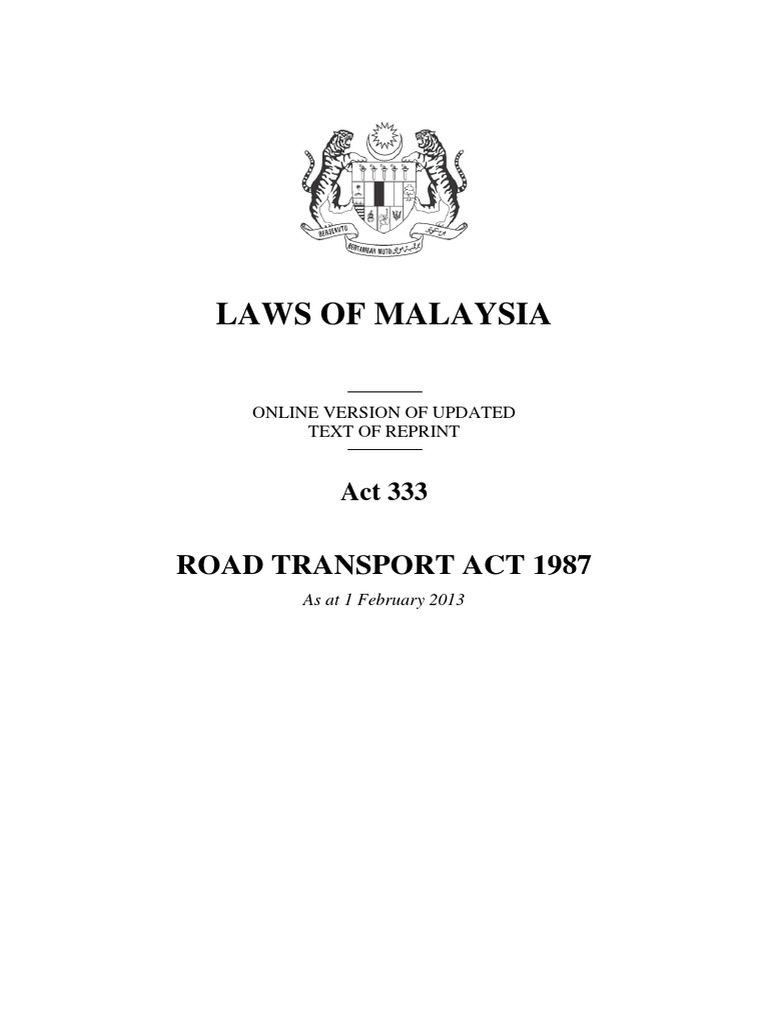 Incorporating all amendments up to 1 july 2006. Under section 44 of the road. To make provision for the protection of third parties. Protection third from the risks associated with the use of motor vehicles; The main regulatory law on road transportation in malaysia is the malaysian road transport act since 1987.